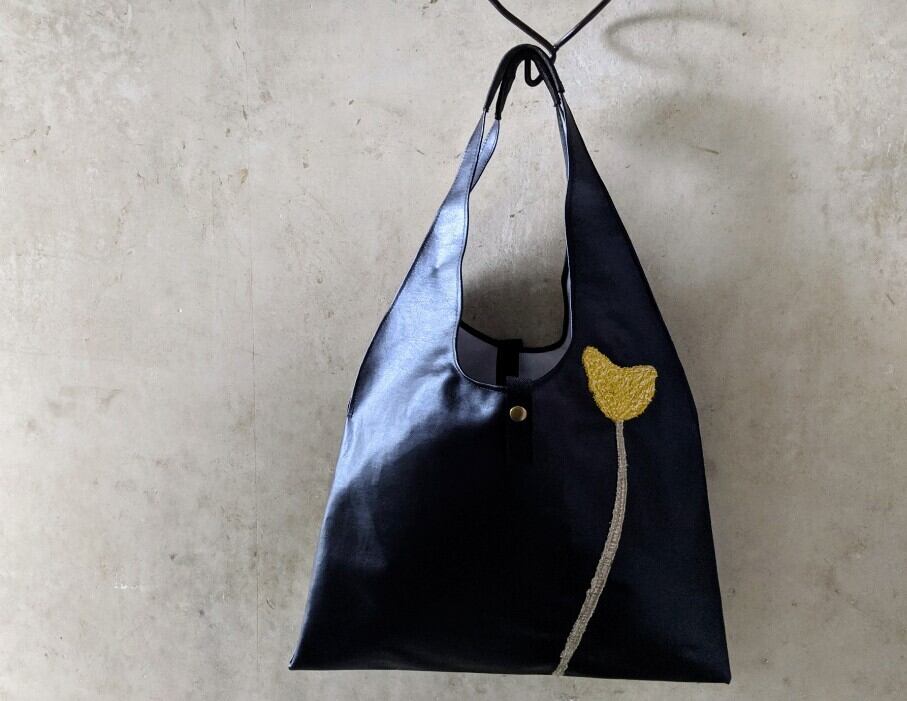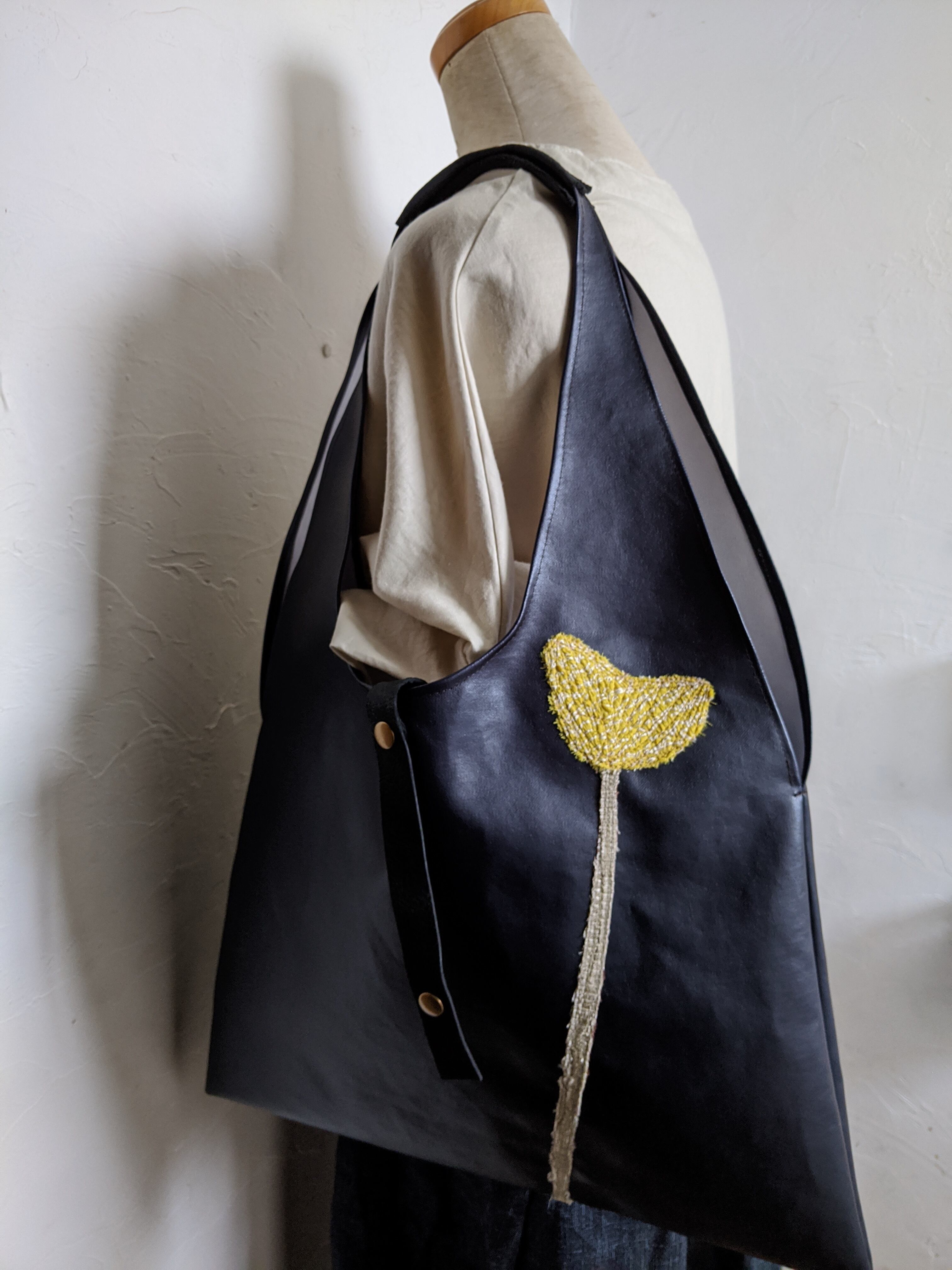 バッグに施されたお花は、桃で染め・裂織したyellowと金木犀染め・裂織のgreenの色合いです