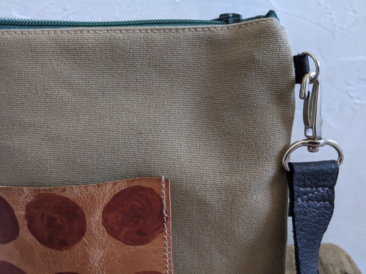 革のポケットのついたコットンのショルダーバッグです